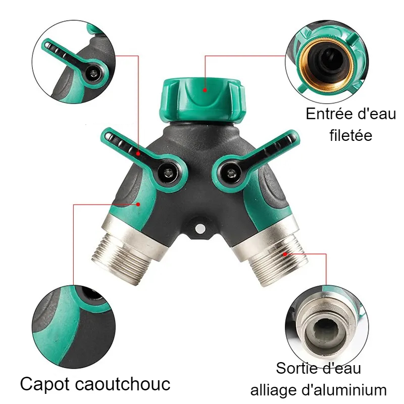 Cet embout de tuyau à deux voies poignée en caoutchouc est un séparateur à deux embouts de sortie pour y brancher deux tuyaux et avoir deux voies d'arrosage séparées, bien pratiques dans de nombreux cas. Fabriqué en alliage de zinc, il est très solide et son étanchéité permet une économie d'eau et une tranquillité d'esprit.