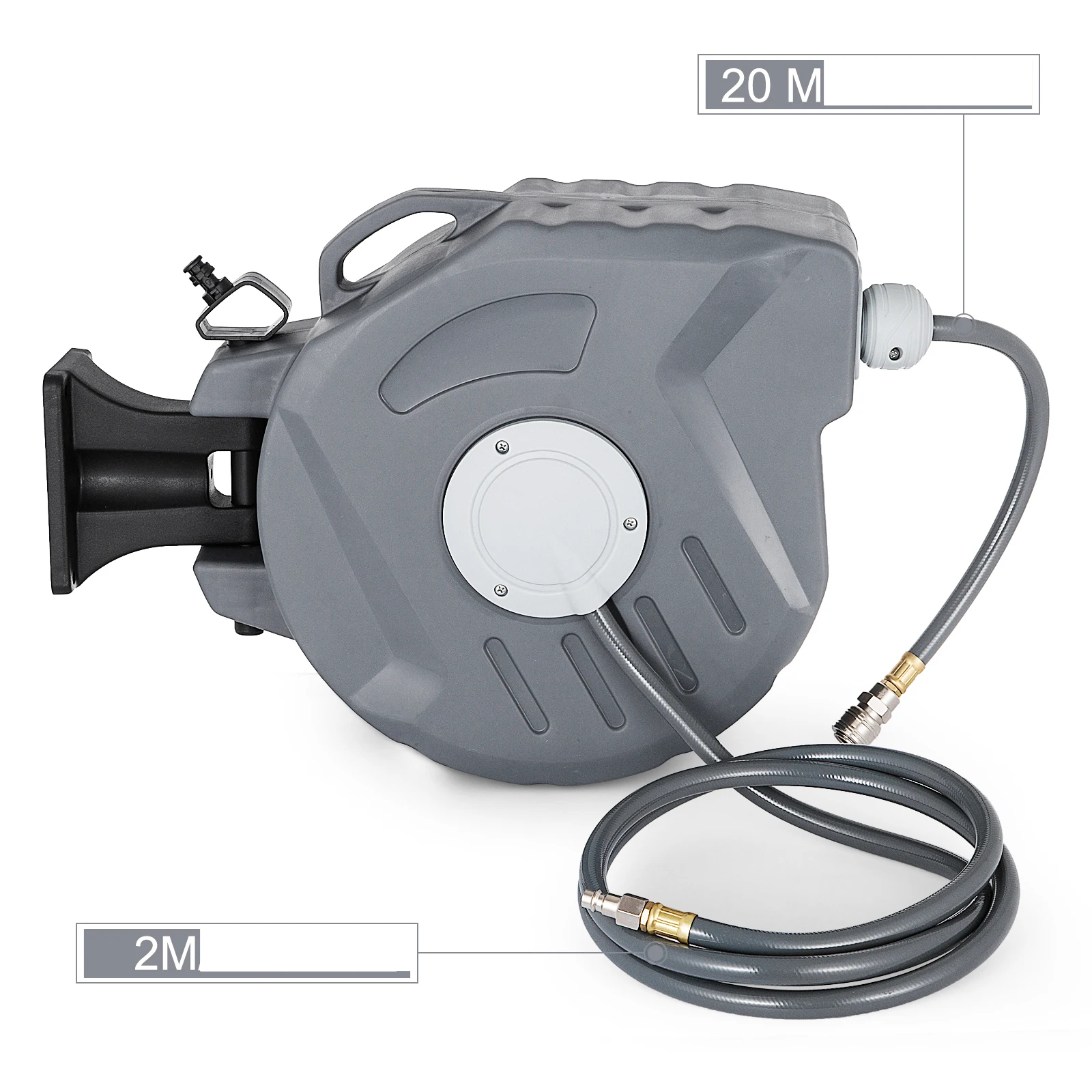 Sa bobine de tuyau peut être installée de manière flexible sur le mur avec une rotation de 180°. Fixé avec des supports muraux, l'enrouleur de tuyau se place fermement là où vous souhaitez. Avec sa fabrication en plastique, le bouchon de cordon, épais et résistant aux chocs, peut ajuster la longueur du pipeline de sortie laissé à l'extérieur, avec une excellente résistance à la contraction et une traction manuelle plus pratique.
