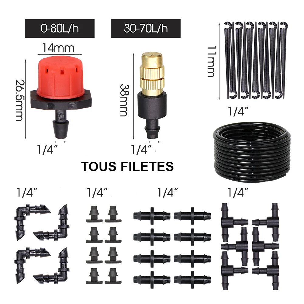 Ce kit d'arrosage automatique en 60W permet de multiples combinaisons pour arroser tous les types de plantes, fruits, fleurs, arbres. La pompe est équipée d'un filtre et les diamètres d'entrée et sortie sont standard. Avec ce système, le débit d'eau reste constant, la pression efficace est uniforme et l'arrosage devient facile, adaptable à chaque plante ou chaque type de plante.