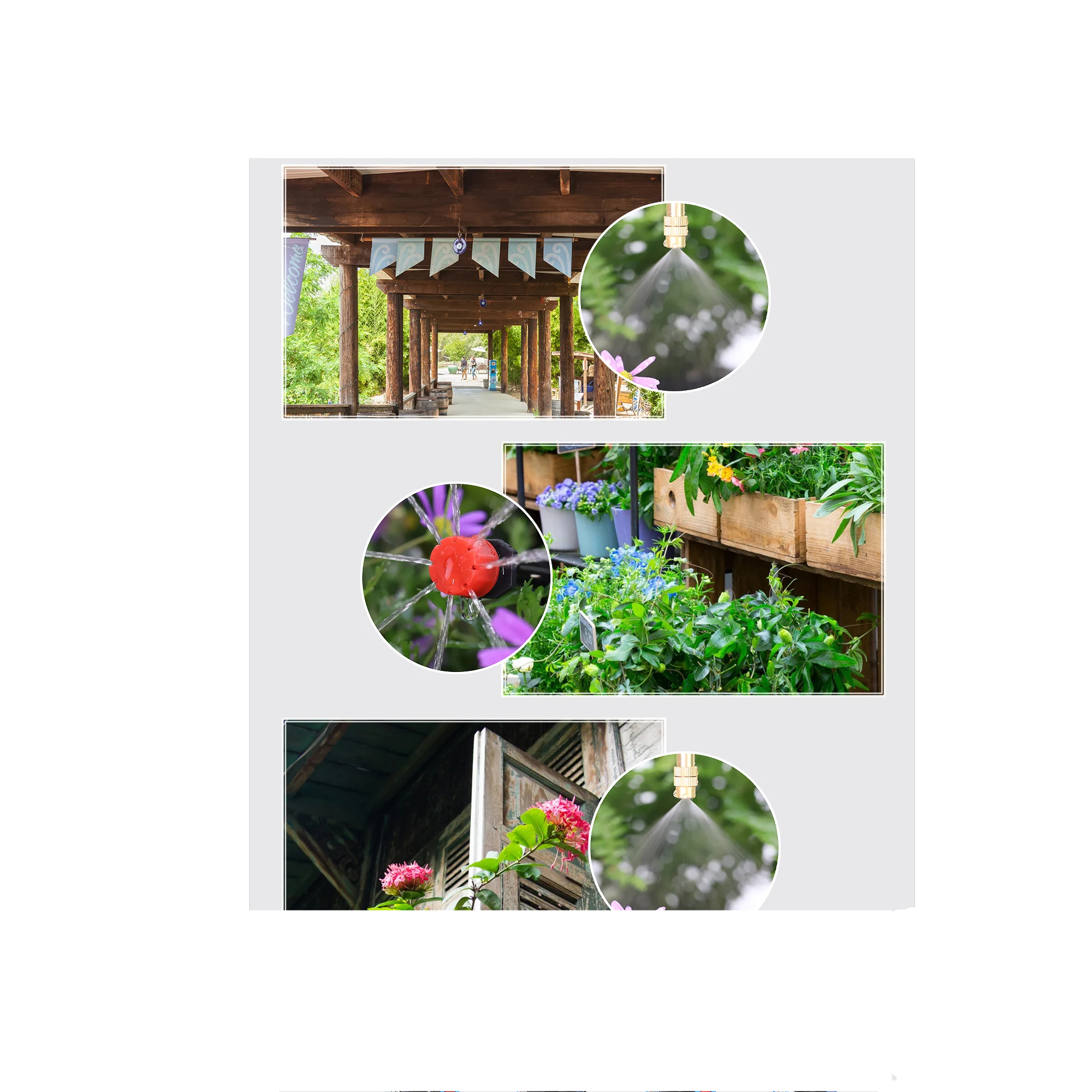 Ce kit d'arrosage automatique en 60W est doté de goutteurs à 8 trous et de buses : vous pouvez utiliser l'un ou l'autre selon le résultat désiré. Les buses vous donneront une brumisation dont vous pourrez contrôler et la direction et la force du débit. Pour les goutteurs, l'ajustement du débit est également très simple et peut aller du goutte-à-goutte à l'arrosage large à 8 sorties, encore une fois plus ou moins fort.