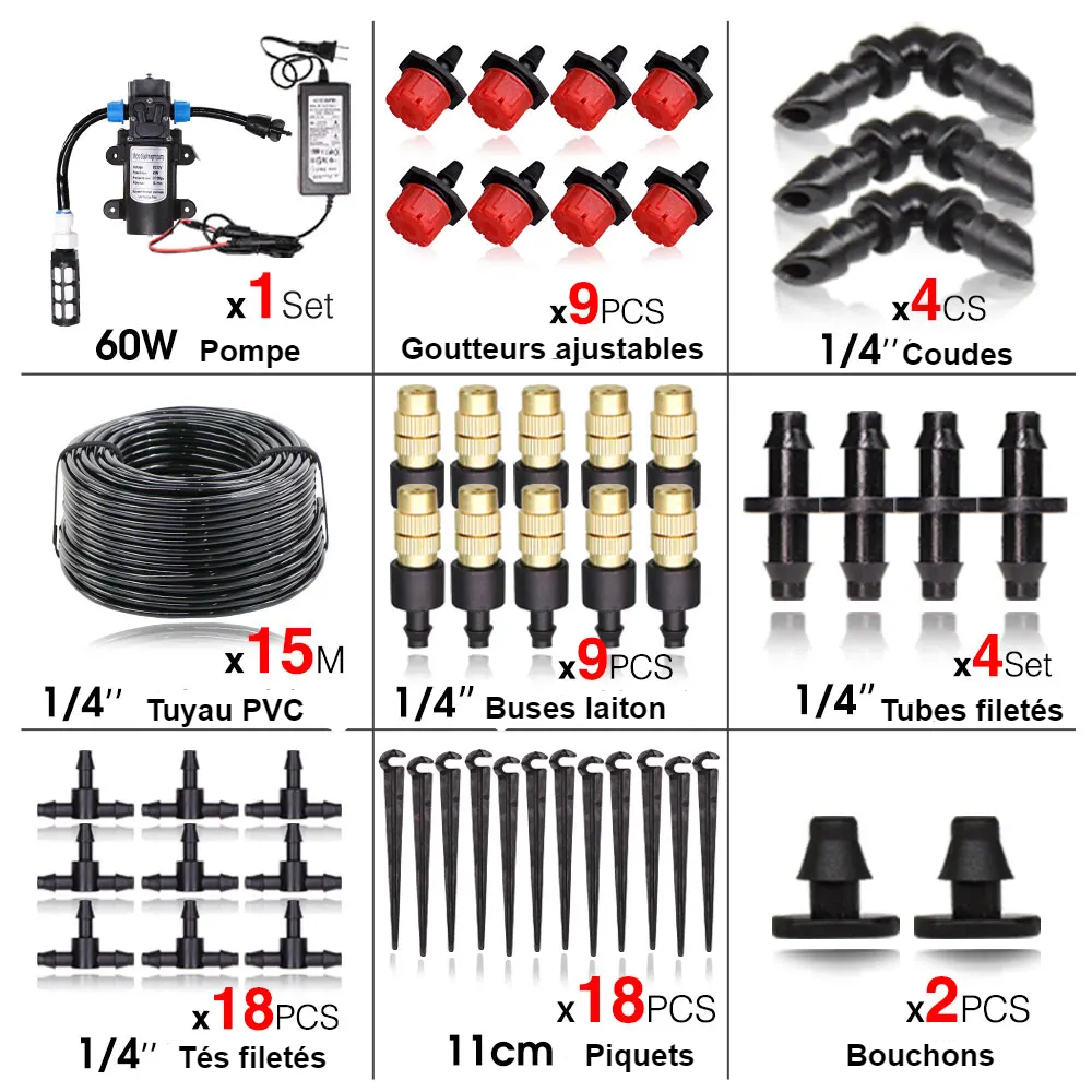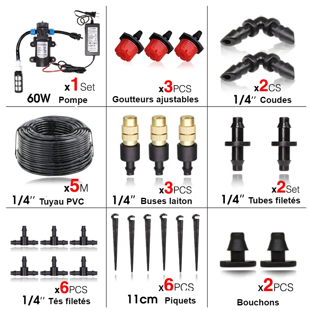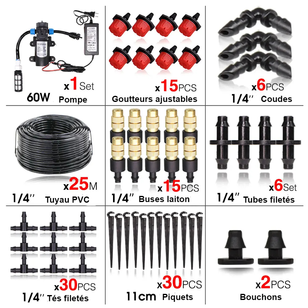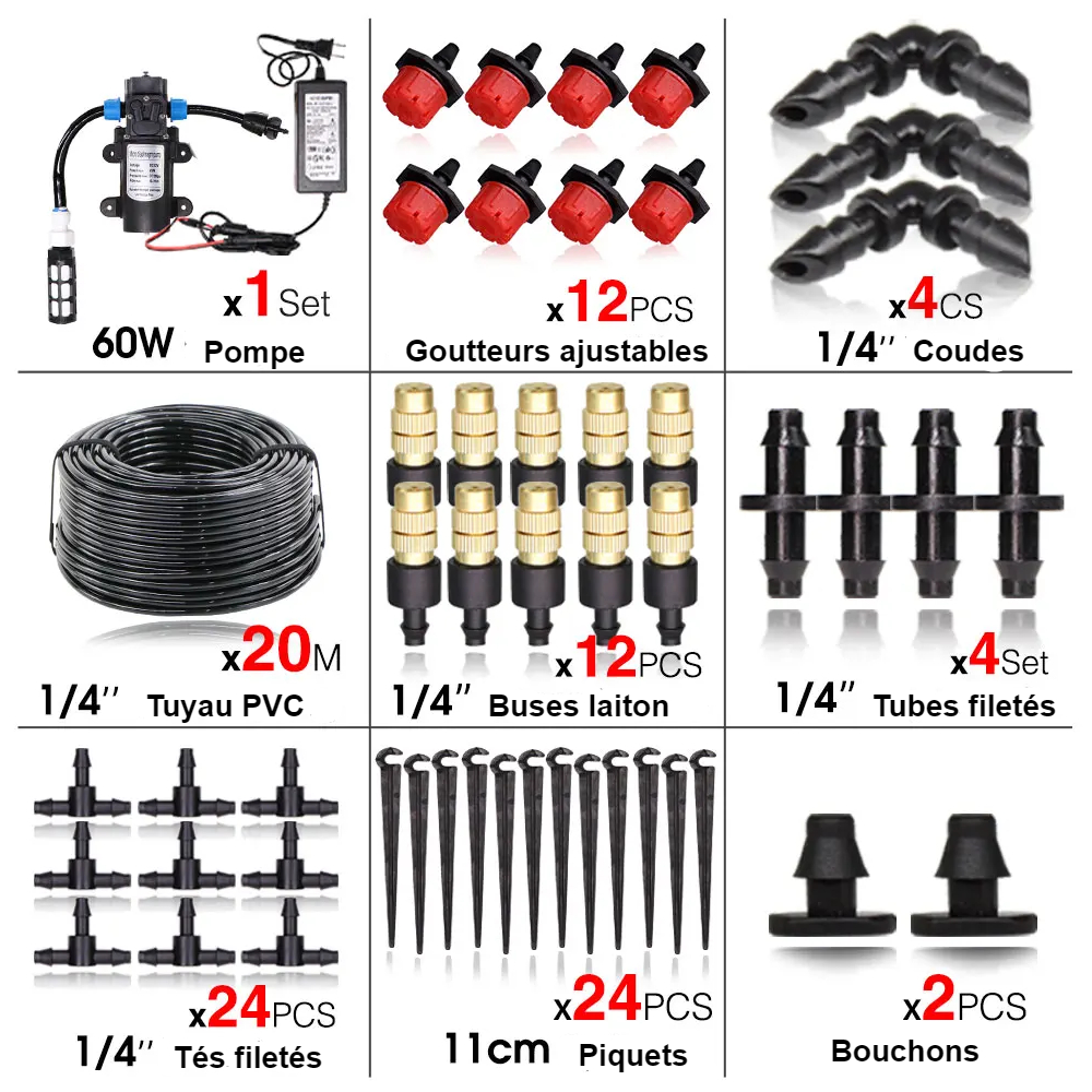 Ce kit d'arrosage automatique en 60 Watt comprend 6 variantes à choisir selon le longueur du tuyau de 5 à 30 mètres. Chaque kit est doté du nombre de composants adéquat, ainsi vous ferez un choix éclairé par rapport aux besoins spécifiques de votre plantation, qu'elle soit en pots ou en pleine terre. La pompe est complète, il ne reste qu'à l'installer.