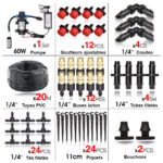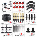 Ce kit d’arrosage automatique en 60W est proposé en six kits différents par la longueur du tuyau et le nombre des composants qui l’accompagnent. Votre choix sera lié à la superficie d’arrosage puisque vous aurez dans tous les cas buses et goutteurs pour palier à l’irrigation de tous types de plantes.