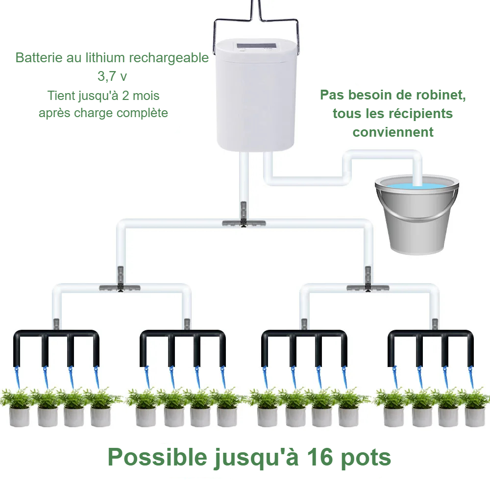 Ce kit d'arrosage automatique goutte-à-goutte est conçu avec un minuteur à écran LED très simple à utiliser. Il sera suspendu grâce au crochet car non étanche, il est adapté à un usage en intérieur. Sa batterie au lithium est rechargeable avec son câble USB et peut fonctionner jusqu'à deux mois une fois chargée, chargement complet en 5 heures.