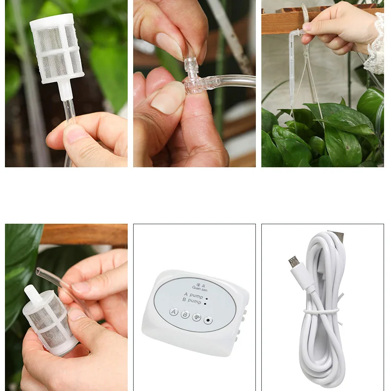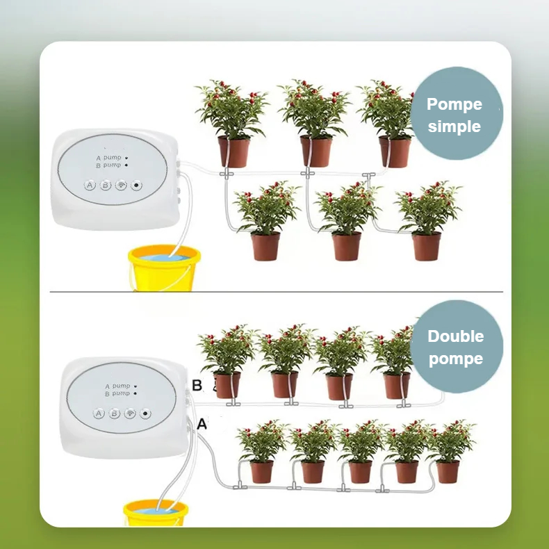 Ce kit d'arrosage automatique goutte-à-goutte ne nécessite pas de raccord à un robinet, un simple récipient rempli d'eau est parfaitement suffisant, le volume d'eau en adéquation avec le nombre de plantes à irriguer bien évidemment. Les deux pompes fonctionnant séparément, il est possible de programmer l'irrigation de deux circuits différents par rapport aux besoins de vos plantations.