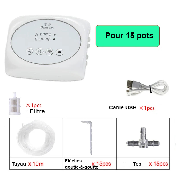 Ce kit d'arrosage automatique goutte-à-goutte vous est proposé en trois modèles suivant le nombre de plantations en pot que vous avez besoin d'irriguer : modèle 1 pour 15 pots, modèle 2 pour 20 pots et modèle 3 pour 30 pots. Tous les kits sont complets et prêts à être installés : ils comprennent le minuteur et son câble USB, le tuyau dans le métrage correspondant, un ou deux filtres et le nombre de tés et de flèches goutte-à-goutte adéquat.