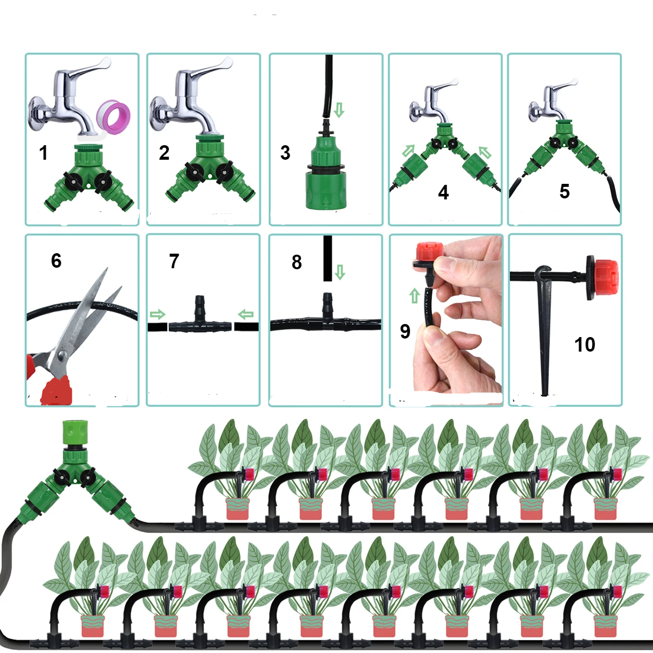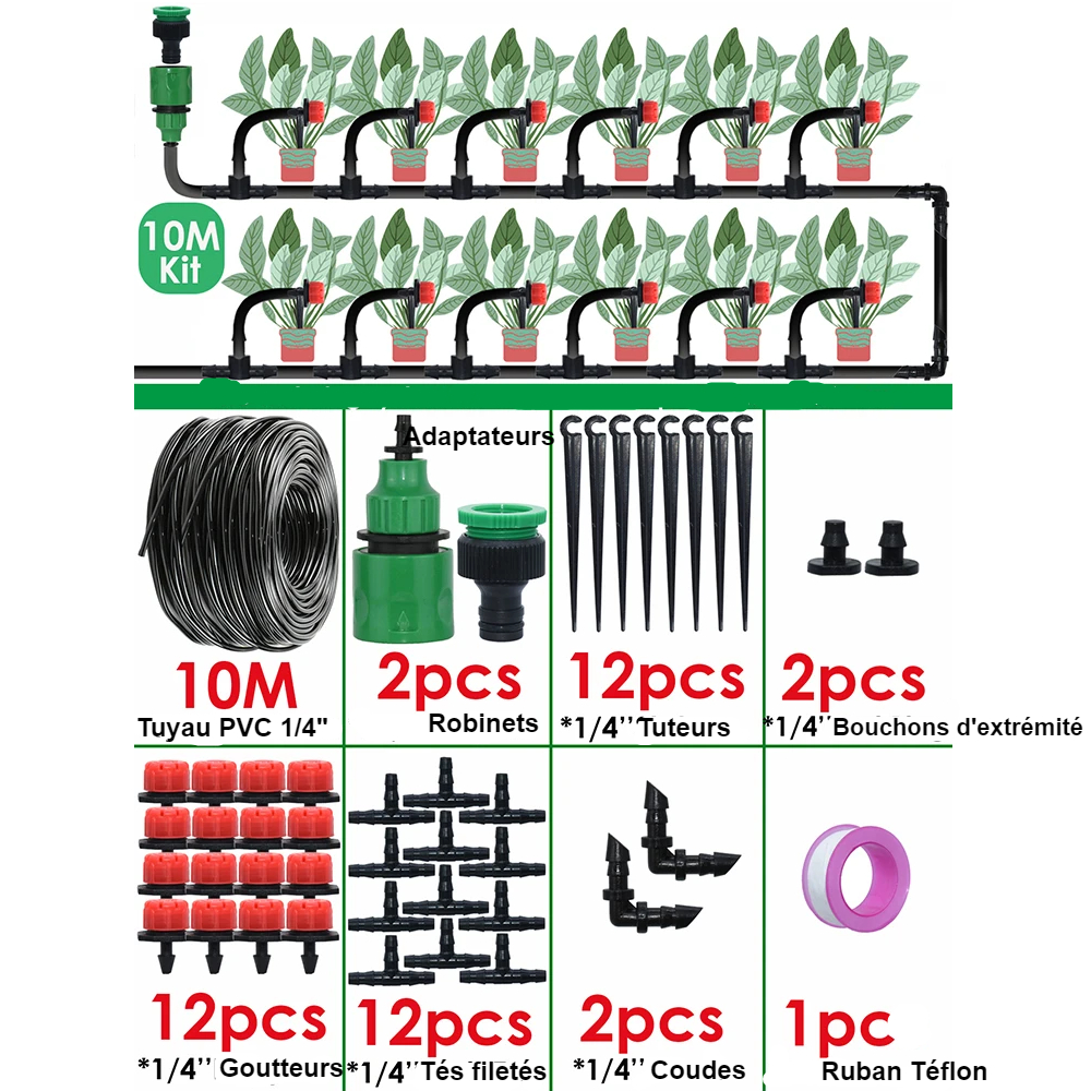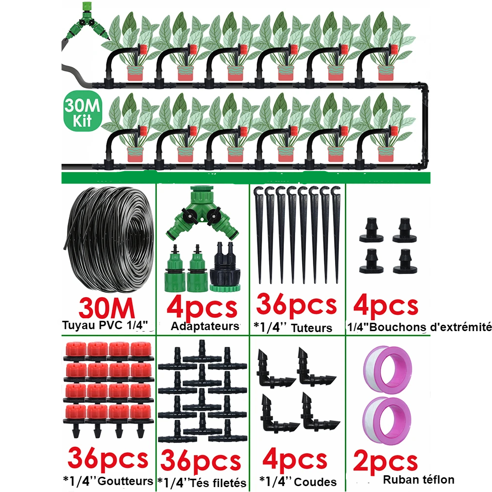Ce kit d'arrosage goutte-à-goutte 10 à 30 mètres sera votre allié dans le projet personnalisé d'irrigation de votre espace de jardin, de potager ou autre, et saura même guider les plus débutants pour un arrosage raisonné et économe en eau, synonyme de respect de l'environnement, et pourtant efficace et bénéfique aux plantes, fleurs et légumes.