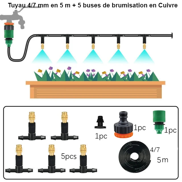 Ce kit de brumisation buses en cuivre avec ses quatre variantes permet d'irriguer des jardins ou potagers de taille moyenne, des parterres de fleurs ou même vos plantations en pot. Grâce à la brumisation, pas de gaspillage d'eau et surtout une irrigation harmonieuse et uniforme. Il vous est toujours possible de le coupler à un système déjà existant de même largeur ou différente grâce au connecteur double embout.