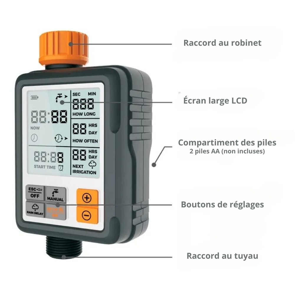 Ce programmateur arrosage automatique avec écran LCD offre des réglages flexibles d’une seconde à 12 heures, une étanchéité robuste pour une utilisation extérieure durable, et un écran LCD clair pour une lecture facile des programmations. Il vous permet de gérer l’arrosage de votre jardin avec précision, simplicité et tranquillité d’esprit.